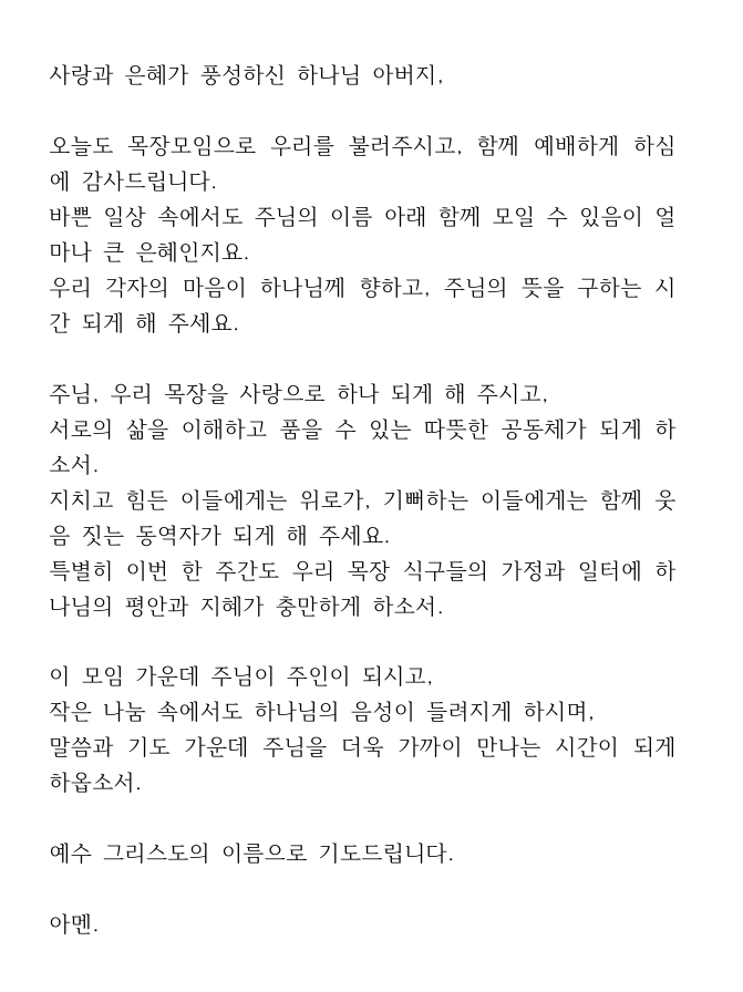 이번 글에서는 목장모임 기도문을 안내해 드리겠습니다.
