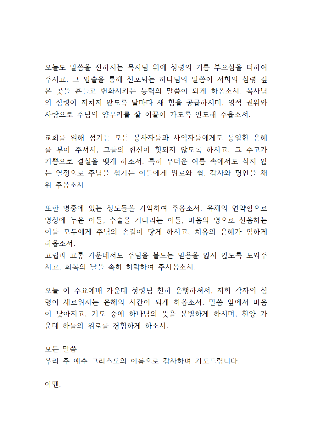 이번 글에서는 7월 마지막주 수요예배 대표기도문을 안내해 드리겠습니다.