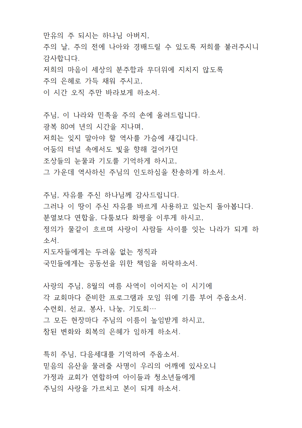 8월 둘째주일낮예배 대표기도문