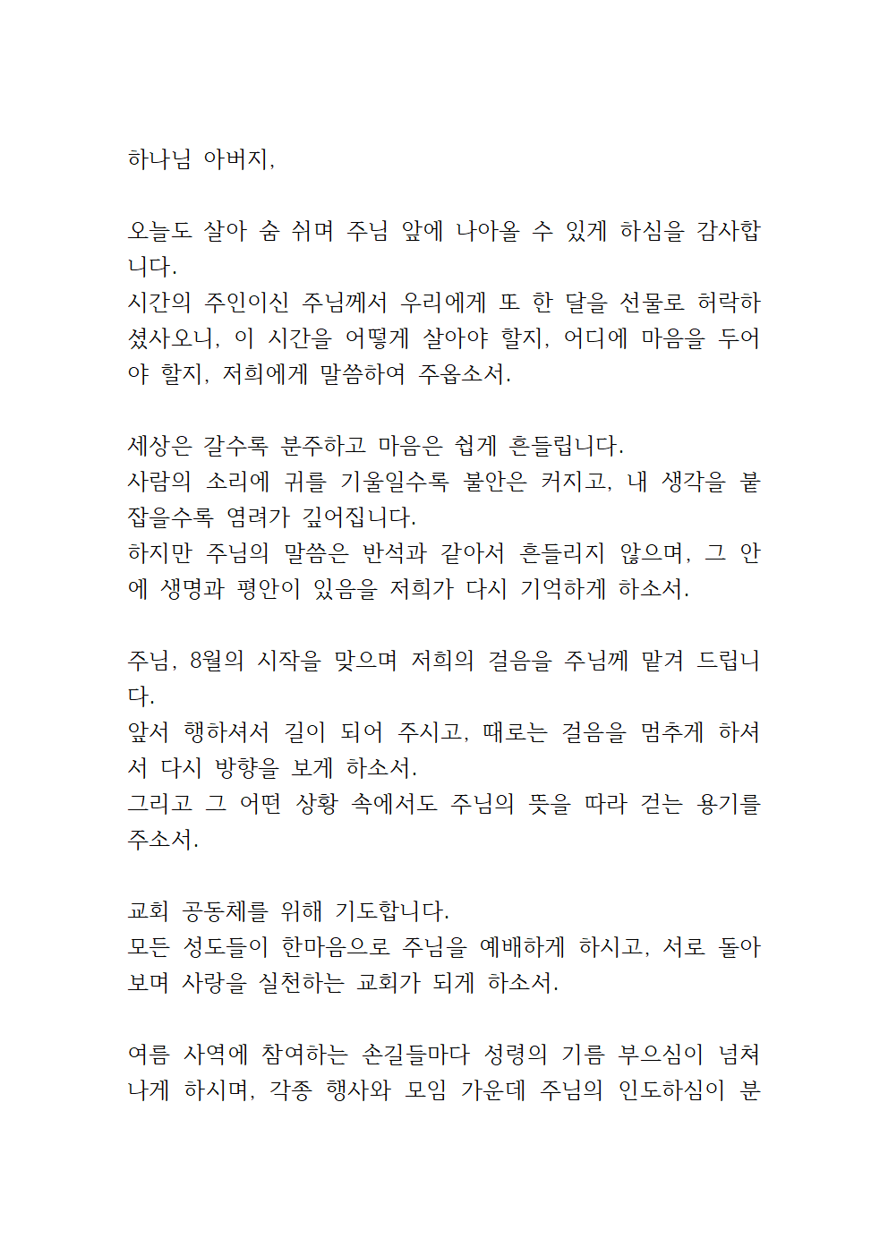 8월 첫째주일낮예배 대표기도문 (파일 첨부)